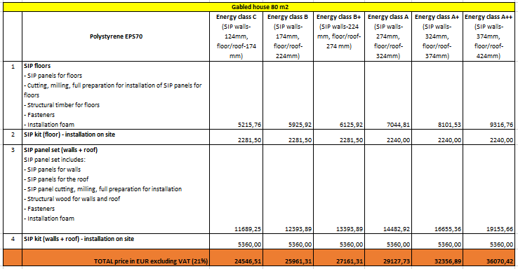 SIP panel KIT prices according to building energy classes: